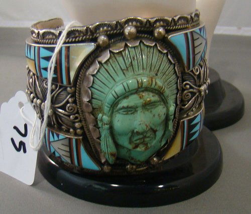 LARGE STERLING INDIAN CHIEF TURQUOISE CUFF