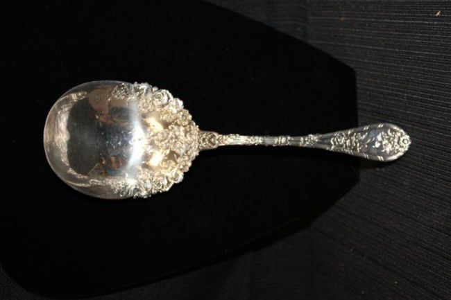 SoldLarge Pierced Sterling Silver Serving Spoon PlusFine pierced serving spoon with ornate scalloped floral handle. Marked 925/1000, fine sterling, PAT 1896, with a horse holding a "W". Repousse sterling tongs. Marked sterling, 925. Early Gorham sterliSee Sold Price