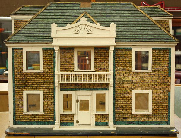 Schoenhut two-story Doll House. Painted wood with pressed cardboard roof, metal windows. Front opensSchoenhut two-story Doll House. Painted wood with pressed cardboard roof, metal windows. Front opens to reveal two rooms on each floor. Comes with three pieces of wood Schoenhut furniture as shown. Ov