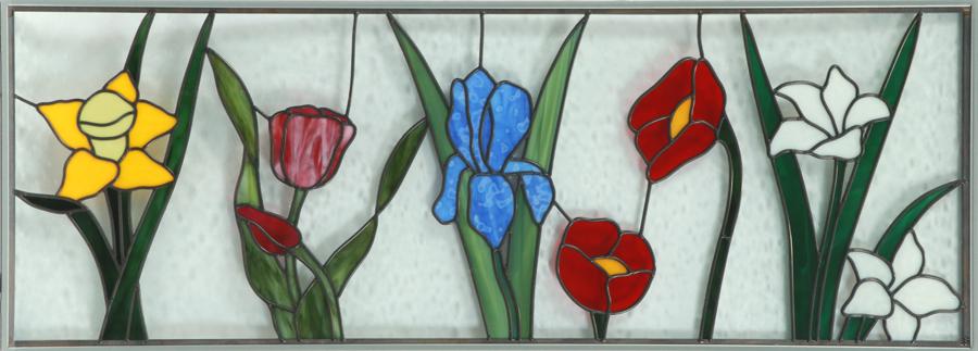 Sold(3) stained glass windows(3) stained glass windows, c/o pair tulip decorated, with wood frames, and transit window with tulip decoration, each 43"h x 23"w and 24"h x 52"w, one coming out of the top of frameSee Sold Price