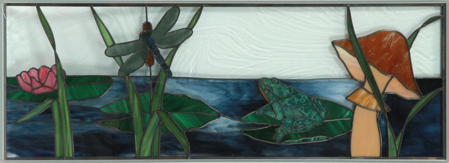 SoldLANDSCAPE STAINED GLASS WINDOW ATTRIBUTED TO TIFFANY STUDIOSA beautiful stained glass window with landscape scene attributed to Tiffany Studios. The 46" tall framed window has a background of swirled blue and purple glass towards the top, becoming yellow and gSee Sold Price