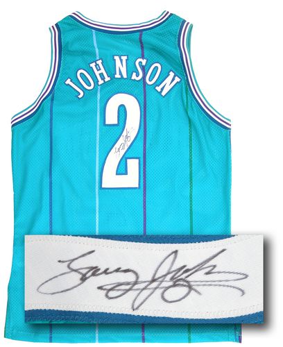 SoldLarry Johnson Signed Charlotte Hornets Champion Framed JerseyAuthentic Champion Charlotte Hornets teal jersey, featuring CHARLOTTE across the front and JOHNSON 2 on the back. The jersey is signed by former NBA All-Star Larry Johnson on the back in black marker.See Sold Price