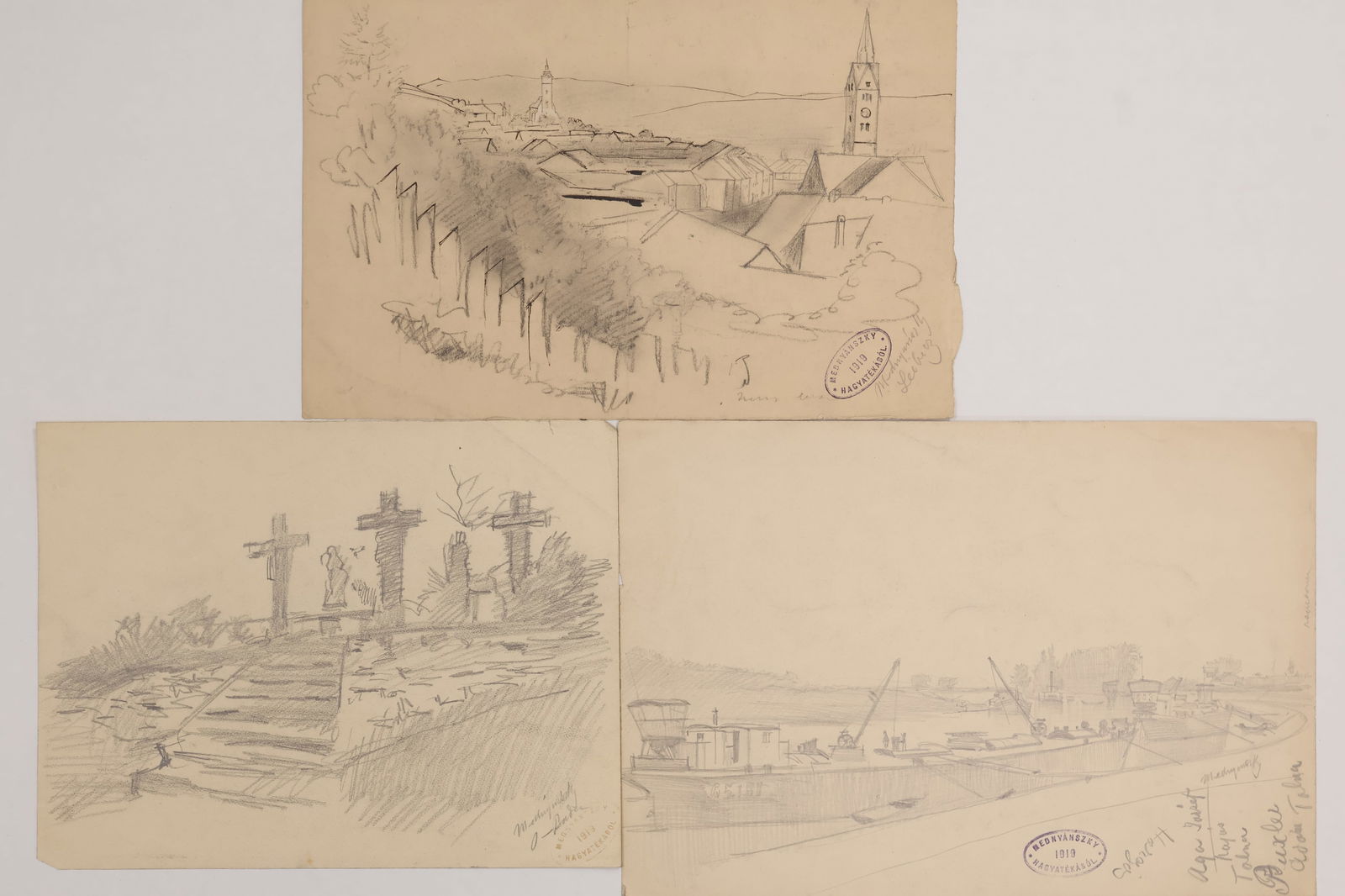 SoldLaszlo MednyanskyThree pencil sketches on paper showing various landscape studies. Signed & inscribed with Mednyánszky 1919 legacy seal / stamp visible. Sheet size: 16”x12” to 19”x13”.ProvenanSee Sold Price