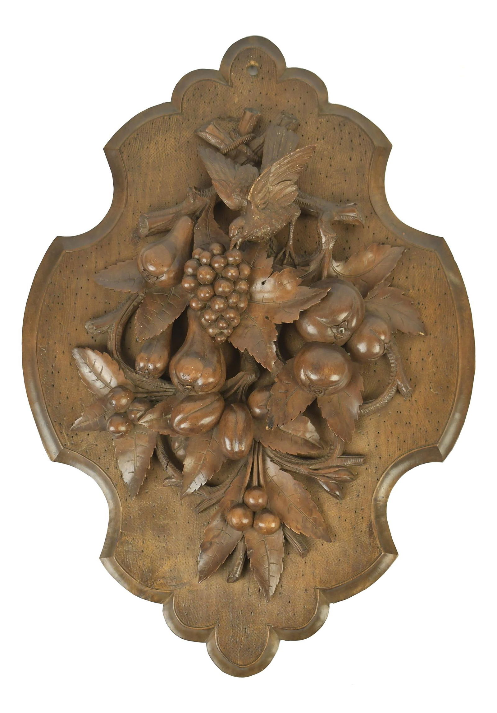 LATE 19TH C. CARVED WALNUT WALL PLAQUE.