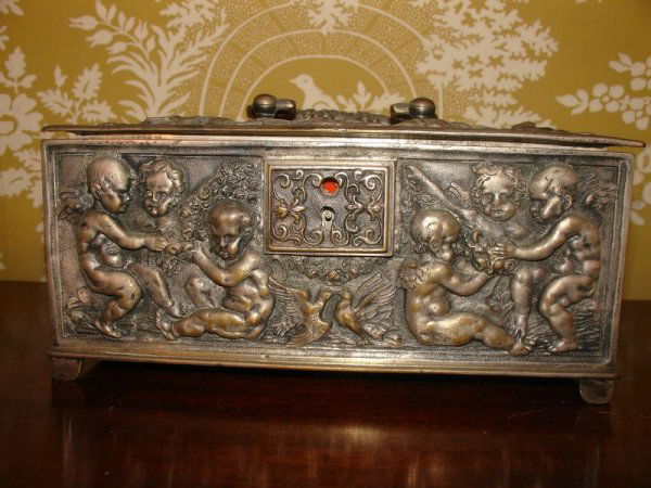 Art Nouveau jewelry box. France, late 19th century-early 20th century. Silver plated metal. One ofArt Nouveau jewellery box. France, late 19th - early 20th century. Silver plated metal. One of the balls of the legs is different. Measurements: 6.5 x 16 x 11.5 cm. Art Nouveau jewellery box with softSee Sold Price
