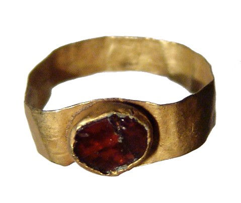 SAMUEL BENHAM 14K GOLD GARNET & DIAMOND RING.