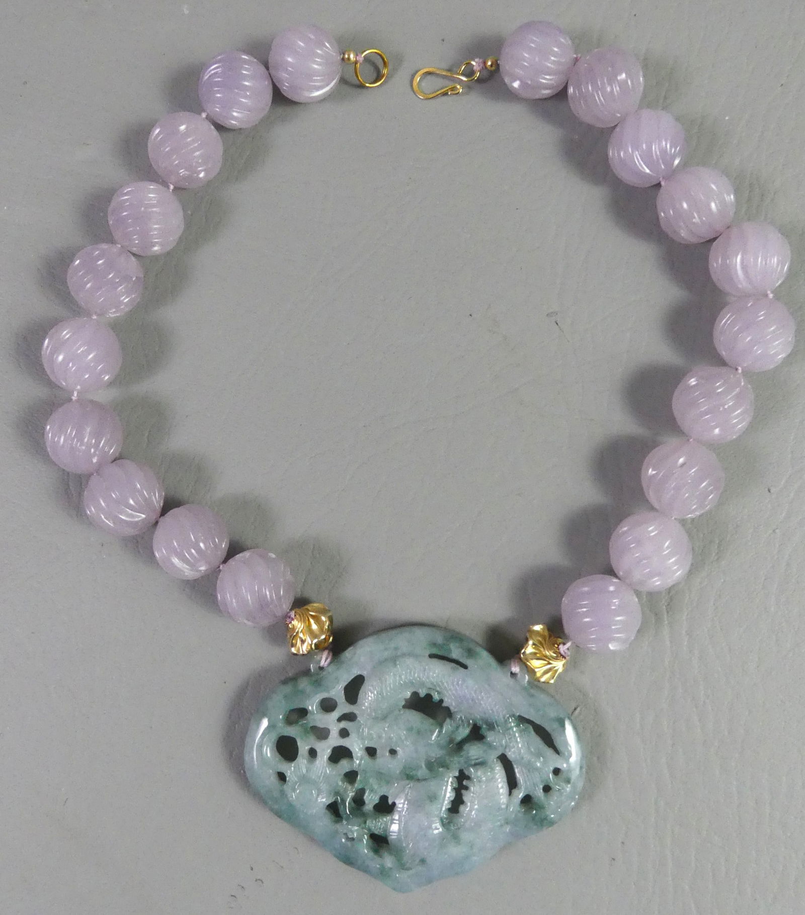 Stylish 18k Yellow Gold Necklace with Carved Jade Spheres & Sculptural Grey-Pink Rose Quartz, 67.02gHIGH END GEMS & JEWELS LTD4.3(1)$4301 day Left