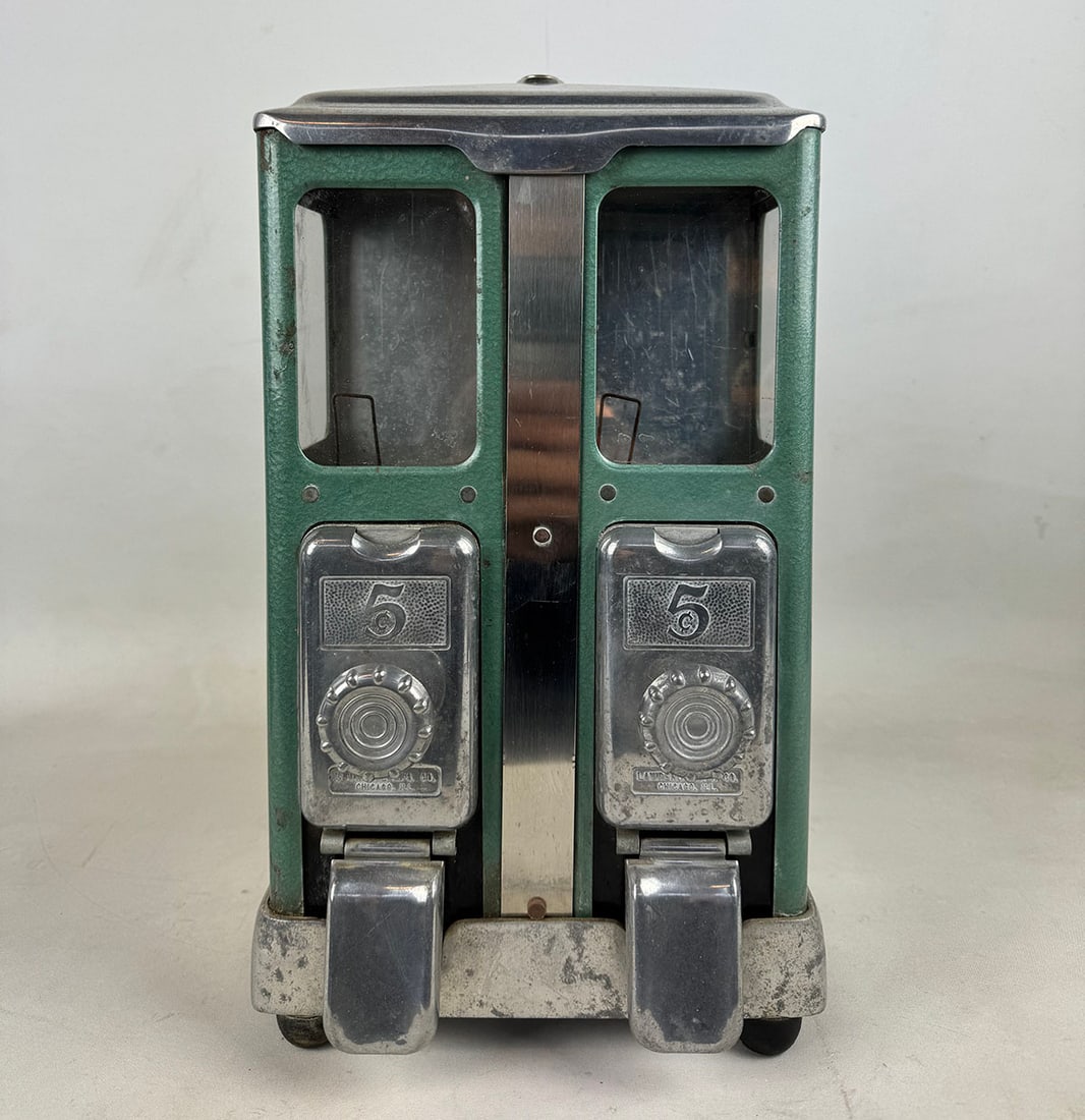 SoldLawrence 2-Column 5 Cent Double Peanut/Candy Bulk Vending Machine ca. 1940Lawrence 2-Column 5 cent double peanut/candy bulk vending machine ca. 1940. Metal case with glass windows. Very good restored visual condition. Comes with the keys. Dimensions (H x W x D): 33 x 20 x 1See Sold Price