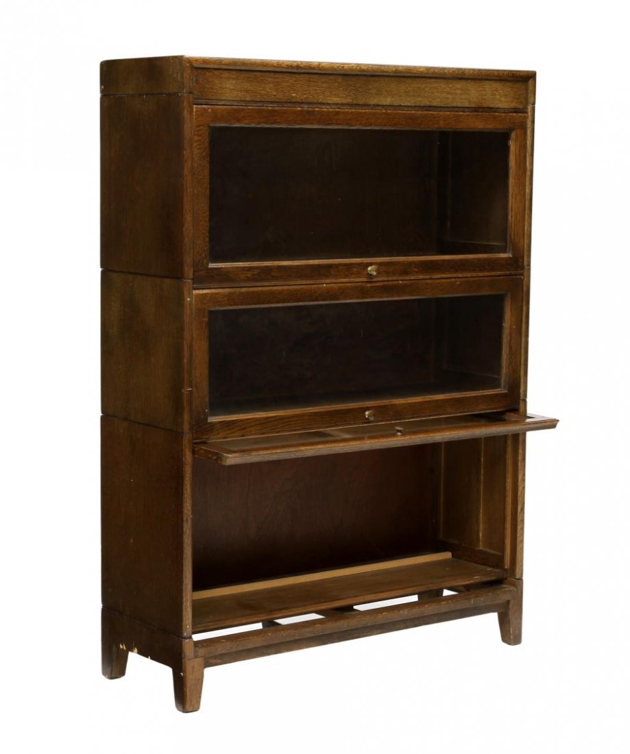 SoldENGLISH OAK THREE STACK LAWYERS BOOKCASE, 1920English oak three stack bookcase with the top bearing a 1920 presentation plaque, the upper stack opens with a drop front drawer opening to stacked storage shelves, 52.5"h, 34"w, 12d Start Price: $100See Sold Price