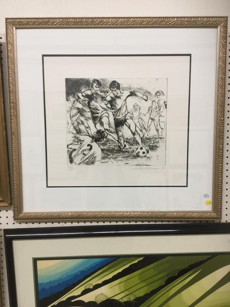 SoldLeRoy Neiman (1921 - 2012) Serigraph, SoccerA pencil signed print, numbered 158/300. Dimensions: Sight is 32" x 25", the frame 39" x 31 1/2". Provenance: From a Main Line collection.See Sold Price