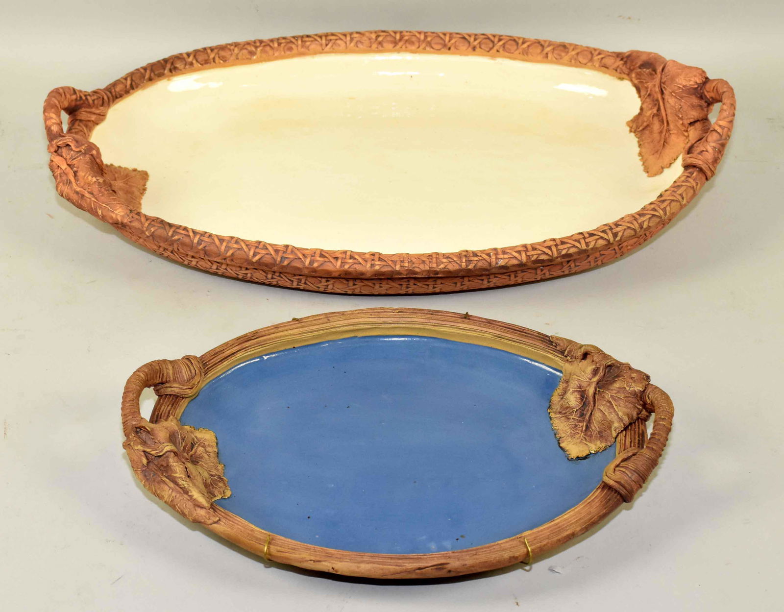 LEAF HANDLED PLATTERS, beige and blue, both signed on
