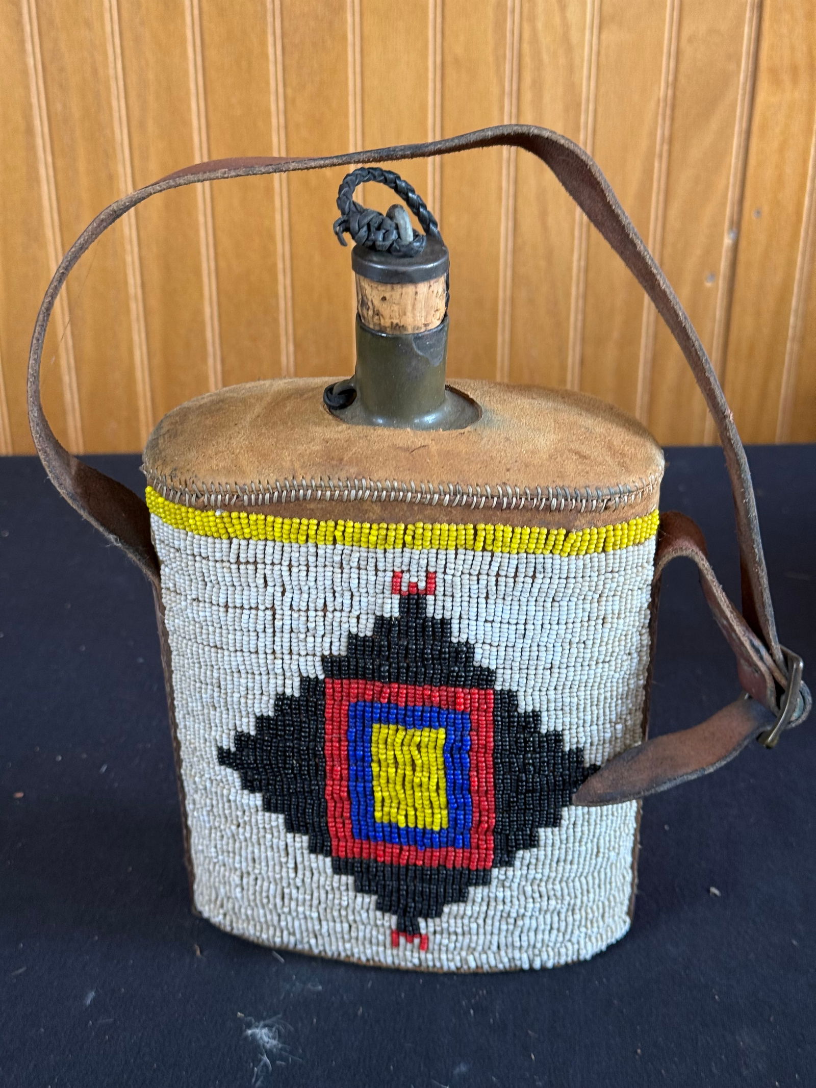 Leather cased canteen w/beadwork