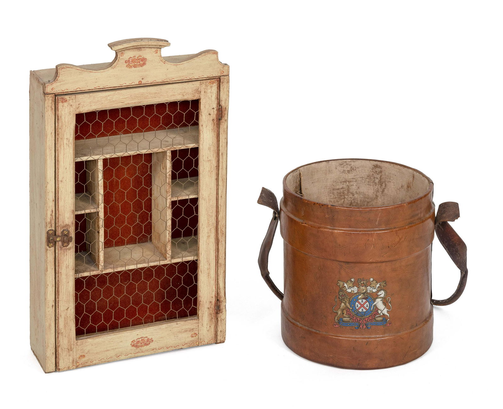 LEATHER FIRE BUCKET AND A WIREWORK FRONT WALL CURIO