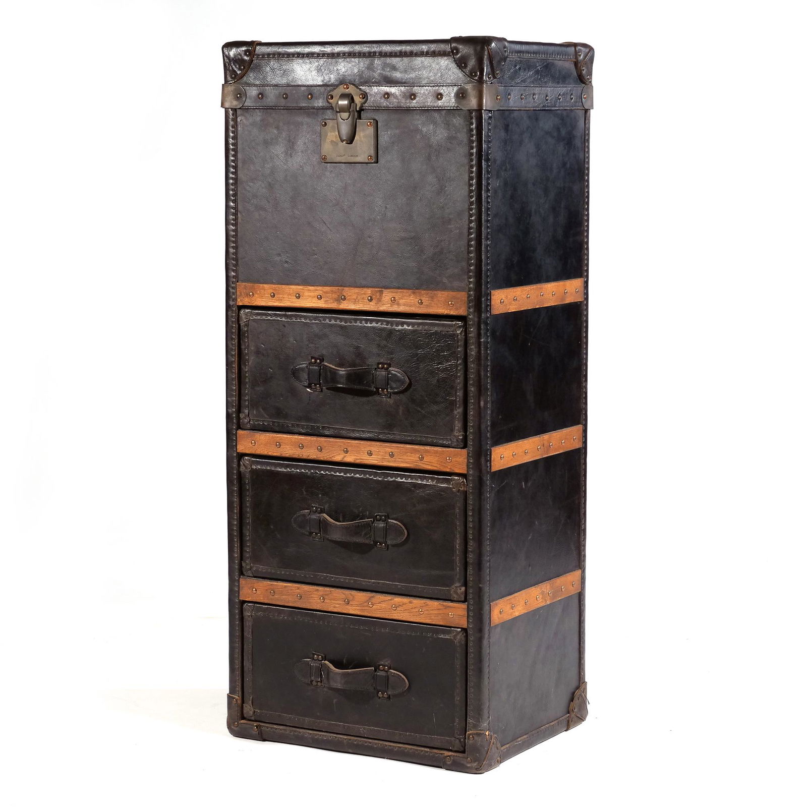 SoldA BRASS BOUND AND STUDDED BLACK LEATHER STEAMER TRUNKLate 19th centuryA BRASS BOUND AND STUDDED BLACK LEATHER STEAMER TRUNK Late 19th century height 28in (71.1cm); width 49in (124.5cm); depth 27 1/2in (69.9cm) Footnotes: Condition reports are not provided in catalog desSee Sold Price