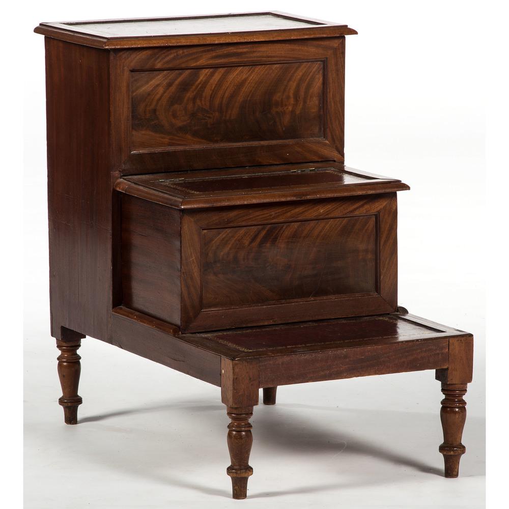 SoldGEORGE III MAHOGANY LIBRARY STEPSThree steps raised on turned feet and green-brown toled leather tops. Hiding a commode with early basin. English, late 18th C.H.: 25'' W.: 21'' D.: 30''See Sold Price