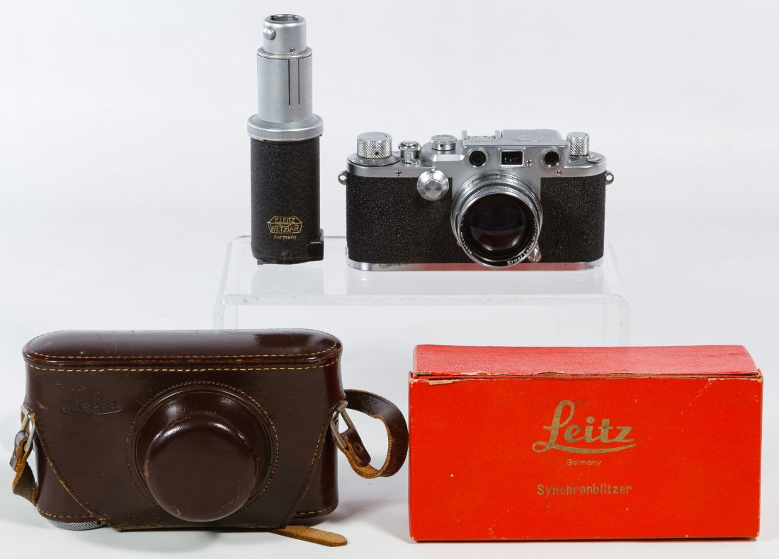 A BRASS-MOUNTED WOOD-BODIED LEICA STYLE CAMERA WITH ELMAR 5CM F/3.5 LENS AND LEATHER CASEHutchinson Scott Auctioneers4.2(48)£150Apr 15, 2026