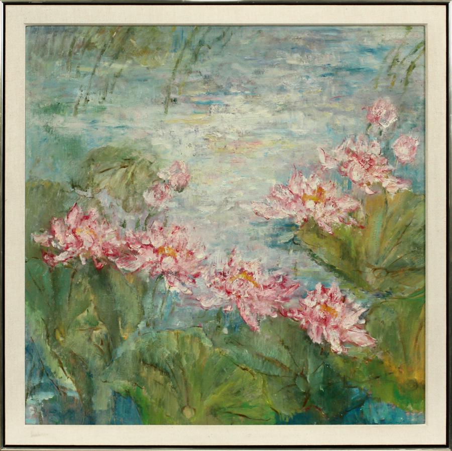 SoldMIA, OIL ON CANVAS, H 36", W 36" WATERLILIESMIA, OIL ON CANVAS, H 36", W 36" WATERLILIES :Leo Duval Associates, Los Angeles, CA, label on verso. Framed.See Sold Price
