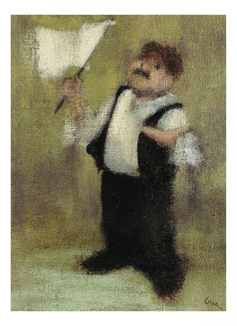 SoldLeonard Creo, "I Surrender"Oil on canvas depicting a man with a flag. Framed. [Art: 12" x 9"; Frame: 15 1/2" x 12 1/2"]. In good condition.See Sold Price
