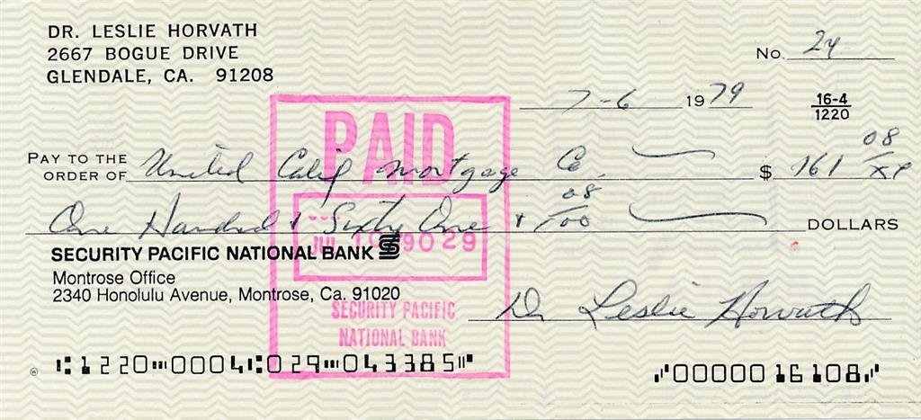 Les Horvath- Signed Check (Heisman Trophy)