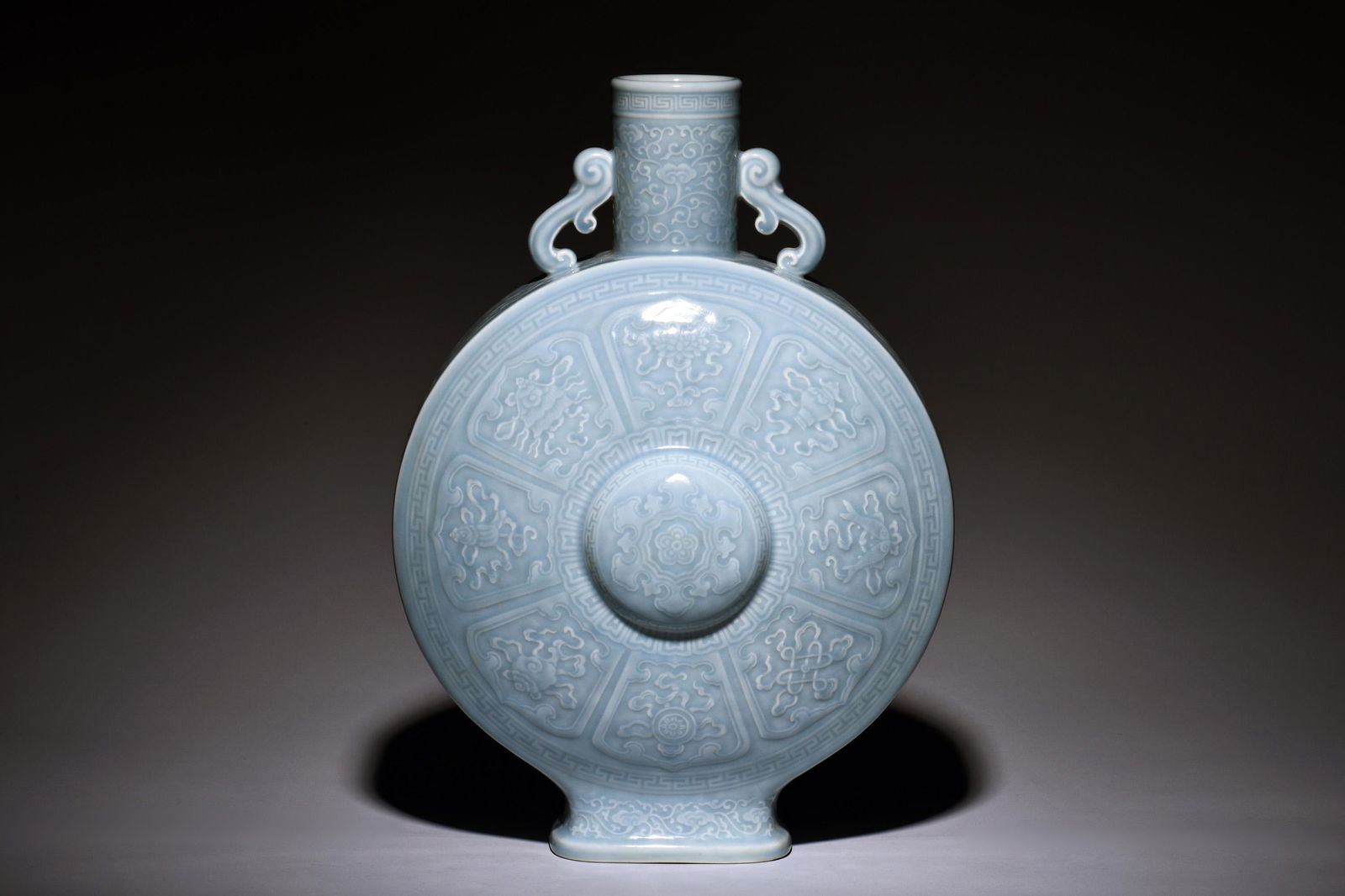 LIGHT BLUE GLAZED 'EIGHT TREASURES' FLASK VASE