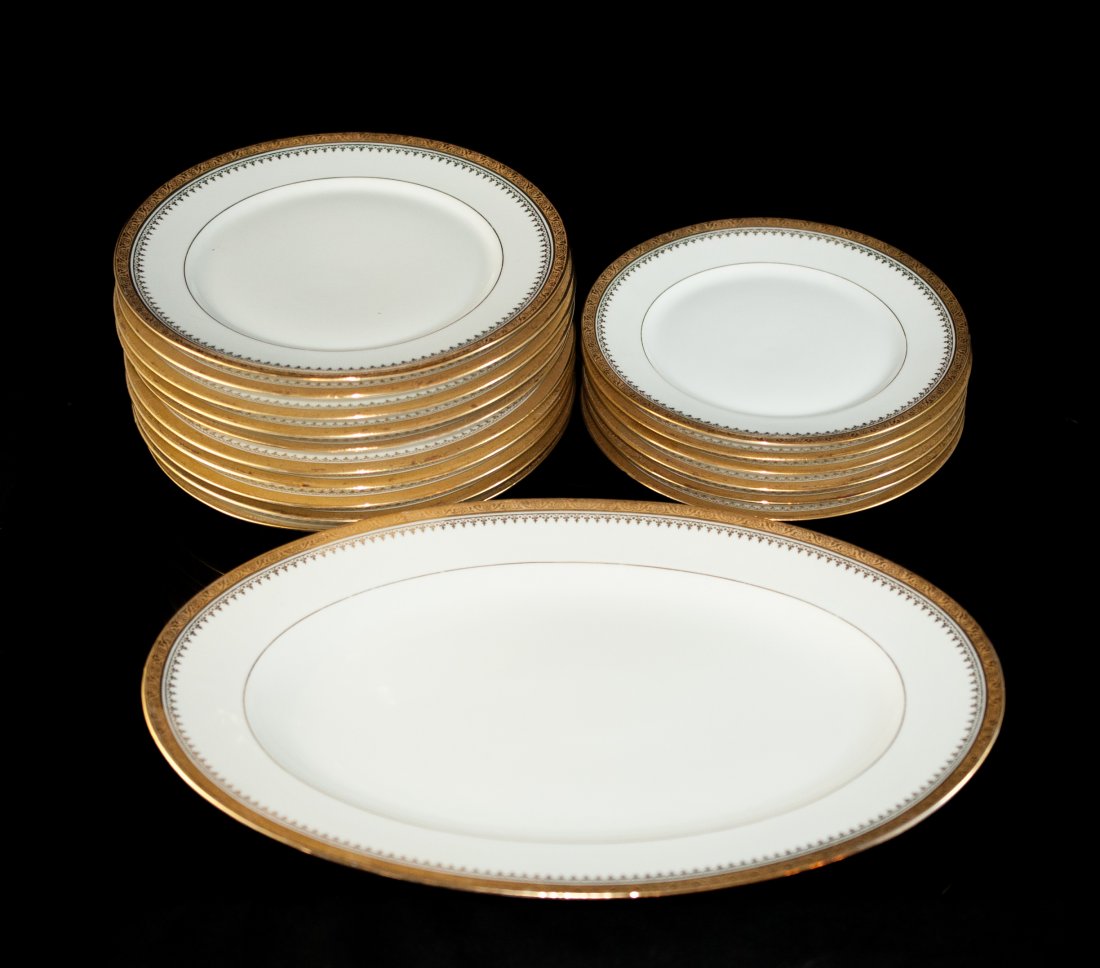 Lot of Shelley Bone China White and Gold Dinnerware PiecesMar 26, 2026Lot of Antique Decorative French Porcelain Plates6 days LeftA. Giraud & Brousseau - Limoges Porcelain Combined Corail Services, 108 PiecesFeb 26, 2026(97) LIMOGES LANTERNIER GILT-ENCRUSTED PORCELAIN DINNER SERVICE4 days LeftRoyal Copenhagen service no. 607. Two oval porcelain dishes. Gold border with foliage. 1940s.Royal Copenhagen service no. 607. Two oval porcelain dishes. Gold border with foliage. Model numberSet of 6 Mintons Porcelain Dinner Plates gold encrusted borders c1880Feb 28, 20268 Minton Tiffany Gold Encrusted & Ivory 9" Plates6 days LeftEnglish and American Porcelain Tableware, 32 Pcs.Mar 12, 2026A Collection of Haviland and Co. Limoges Porcelain Dinnerware in the Old Gold PatternMar 01, 2026Wedgwood "Signet Gold" Porcelain Bowls, 12Mar 12, 2026Set 12 Minton Dinner Plates Pattern H 28506 days LeftSet 2 Jean Pouyot Limoges Dinner Plates 9 5/8"6 days LeftA Set of Assorted Noritake Porcelain DinnerwareMar 01, 2026C. AHRENFELDT LIMOGES PARTIAL CHINA SERVICE6 days Left10 Minton Cobalt & Beaded Gold 10 3/8" Plates6 days Left