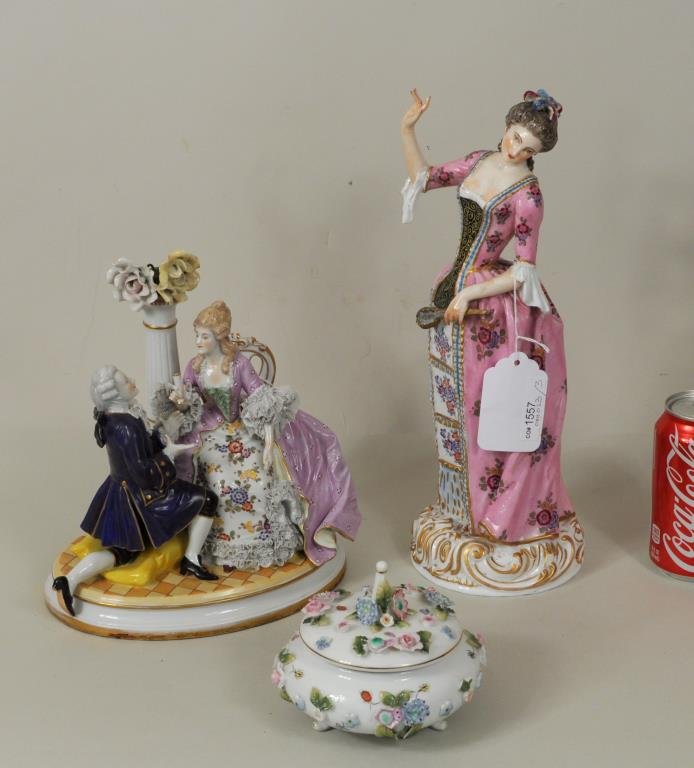Two Meissen Porcelain Figures & Limoges Sugar Bowl
