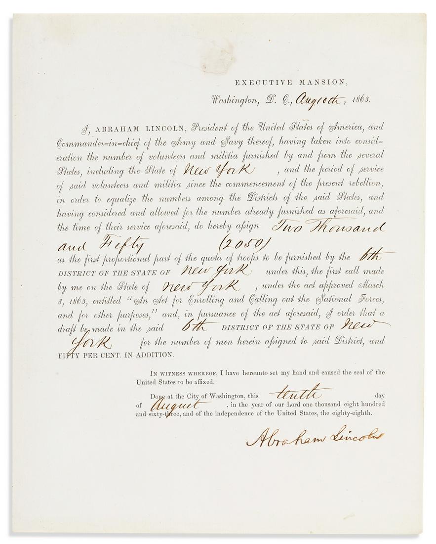 LINCOLN, Abraham (1809-1865). Autograph legal document signed twice ("A. Lincoln" and "AbrahamMar 26, 2026LINCOLN, Abraham (1809-1865). Manuscript document signed twice ("A. Lincoln"), [Springfield], 5Mar 26, 2026LINCOLN, Abraham (1809-1865). Manuscript document signed ("A. Lincoln"), [Springfield], 18 JuneMar 26, 2026Ulysses S. Grant Signed 7.75x10 Ratification Document June 1876 Beckett Authenticated4 days Left[LINCOLN, Abraham (1809-1865)]. Telegraph message to General Samuel W. Crawford in a surrogate hand,Mar 26, 2026[LINCOLN FUNERAL]. Partly printed document signed ("ED Townsend"), for White House doorman Thomas H.Mar 26, 2026LINCOLN, Abraham (1809-1865). Autograph legal document signed ("Davis, Lincoln, Lamon"),Mar 26, 2026Thomas William Galpin – U.S. Consul to Belfast – Autographed Consular Document – I[LINCOLN FUNERAL]. Abraham Lincoln. We, the subscribers, Selectmen of Reading, hereby give noticeMar 26, 2026LINCOLN, Abraham (1809-1865). Proclamation of Emancipation. Chicago: Chas. Shober, 1864.Mar 26, 2026LINCOLN, Abraham (1809-1865). Supreme Court of U. States of America. District of Illinois. Wm.Mar 26, 2026[LINCOLN, Abraham (1809-1865)]. -- SCRIPPS, John Locke (1818-1866). Life of Abraham Lincoln.Mar 26, 2026LINCOLN, Abraham (1809-1865). Proclamation of Emancipation, by the President of the United States,Mar 26, 2026LINCOLN, Abraham (1809-1865). The President to General McClellan. N.p., n.p., n.d. [ca 9 AprilMar 26, 20261903 Theodore Roosevelt Signed U.S. General Land Office Patent with Red SealMar 15, 2026State of New Hampshire – Militia Brigade Orders – War of 1812 Era Document – 1815