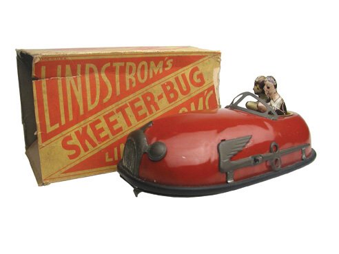 SoldLindstrom ca. 1930s Pressed Steel Windup #934 "Skeeter Bug" Bumper CarLindstrom ca. 1930s pressed steel windup #934 "Skeeter Bug" bumper car, this is a red bumper car toy marked "8" on either side with a man and woman passenger. The toy has early variation side 'wing' bSee Sold Price