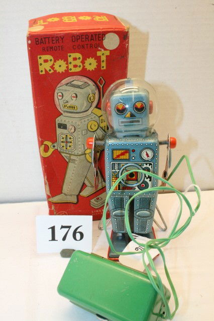 SoldLot Of 2: Japanese Tin Litho Space Toys.Battery operated and friction. R-35 Linemar Robot with a plain red remote control. Second is a Yonezawa Cragstan Astronaut. Crank friction on rear. Both have some spidering to litho. Minor denting andSee Sold Price