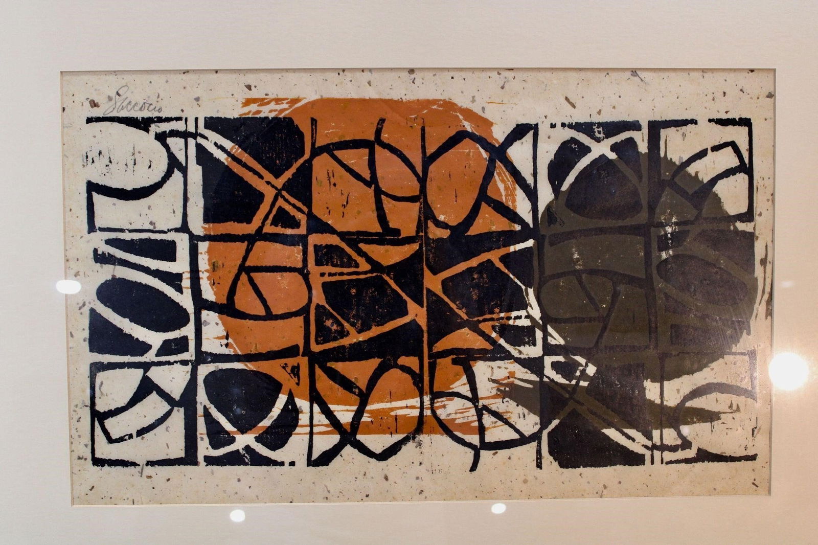 SoldLinocut Abstract PrintA striking Linocut abstract piece captivates the viewer with its intricate dance of bold black lines weaving through a backdrop of earthy reds and muted creams. Signed : Saccocio Approximate MeasuremeSee Sold Price