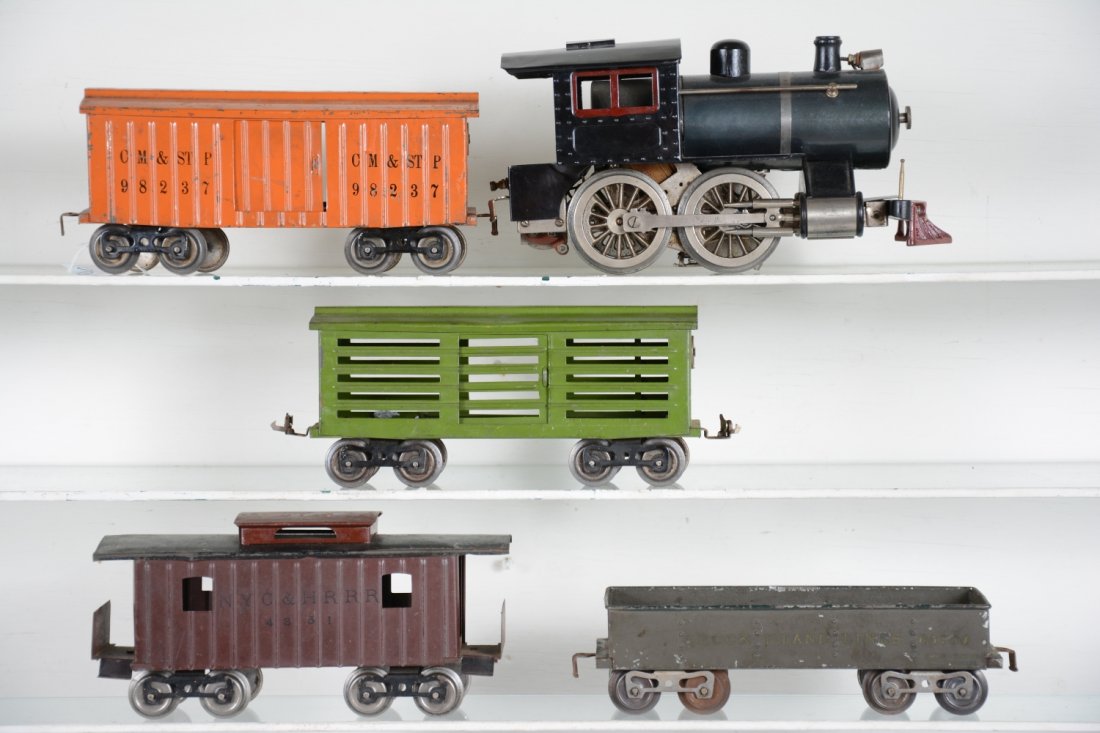 SoldLionel 10 Series SG Freight Set#6 4-4-0 electric steam loco and tender with 6 cars: 16 ballast, 11 flat, 12 Lake Shore gondola, 13 stock, 15 Pennsylvania tanker and 17 caboose e & t - 22.5" l., cars appr. 11" l.See Sold Price