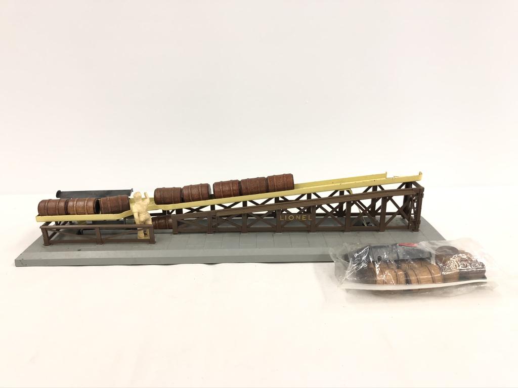 SoldLIONEL TRAINS - OPERATING BARREL LOADER AND MORELIONEL TRAINS - OPERATING BARREL LOADER AND MORE - COAL LOAD/DUMP IS MISSING ROOF - OPERATING CRAIN HAS NO BOTTOM - AS ISSee Sold Price