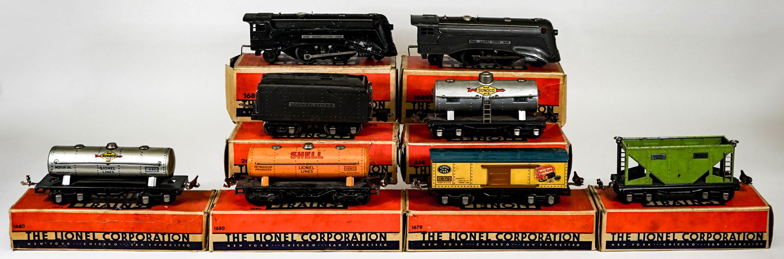 Sold4 Pc Pre War Lionel Train Set4 Pc Pre War Lionel Train Set, "O" with original boxes including: steam locomotive, 2-6-2, No. 224E with Lionel Lines tender, Sunoco tanker car, No. 654 and gondola car, No. 652, with R.L.S. remote coSee Sold Price