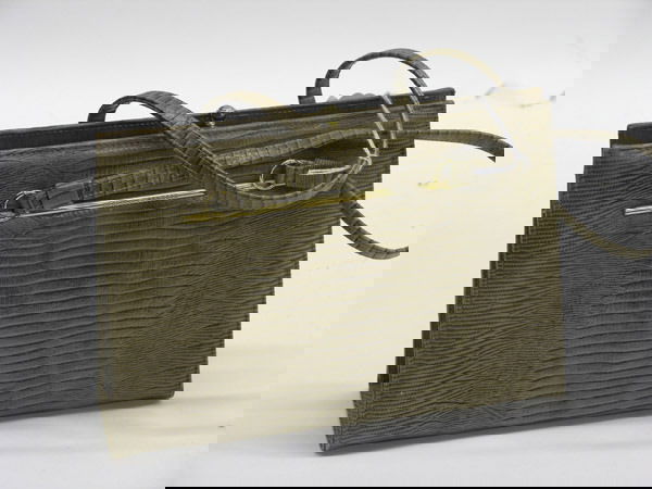 SoldJudith Leiber Lizard Skin HandbagDESCRIPTION: Judith Leiber lizard skin handbag. In original packaging bag. MEASUREMNTS: 7" x 10-3/4". Strap 40". CONDITION: Light wear. Small pen mark to inside.See Sold Price