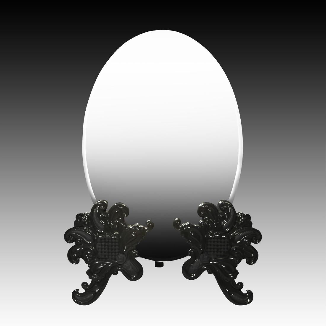 SoldLLADRO BLACK ORNATE VANITY MIRROR TABLETOPLladro Black Ornate Vanity Mirror. Sculptor: Dpto. Diseno y Ornamentacion, Release year 2010. Dimensions: 15"H x 11"L Country of Origin: SpainSee Sold Price