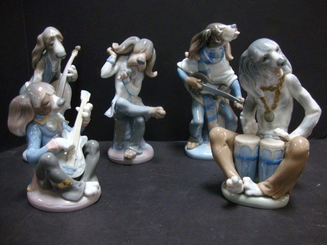 SoldThree Lladro Porcelain Dog Band FigurinesThree (3) Lladro Porcelain Dog Band Figurines. Signed appropriately to bottom. Largest measures 8-1/4" H x 5" W x 4-1/2" D. Condition: Good condition. Estimate: $150.00 - $250.00 Domestic Shipping: $8See Sold Price