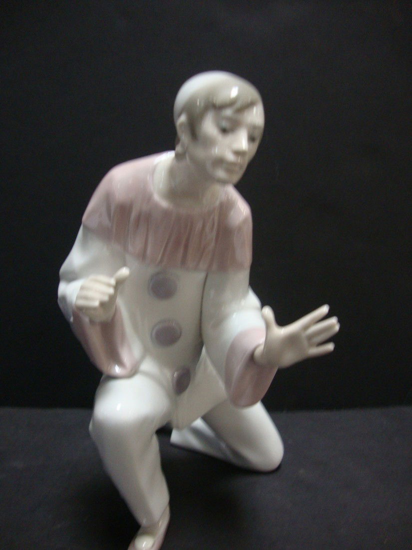 SoldLladro Pierrot Clown FigurineA hand-painted porcelain Lladro figure depicting a kneeling Pierrot clown in soft pastel tones. The piece features Lladro’s signature smooth glazing, delicate facial detailing, and expressive poSee Sold Price