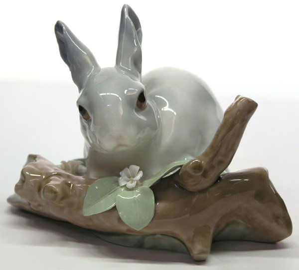 SoldRabbit Eating - Lladro Porcelain FigurineAdorable glazed finished porcelain grey rabbit seated behind a log. The ears are up and alert. Right under the rabbit's nose sits a white flower surrounded by green leaves. Lladro backstamp. Artist: FSee Sold Price