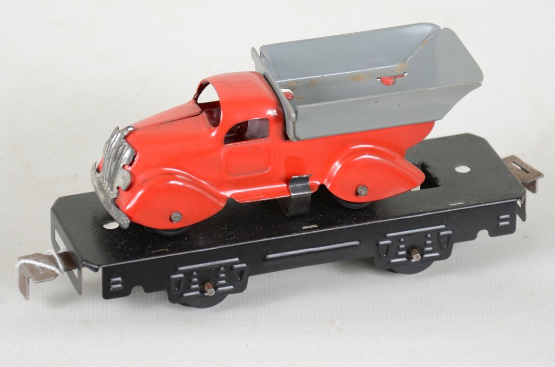 SoldDorfan O Gauge Freight CarsDorfanO Gauge Freight Cars and Marx Flat Car. Dorfan 11201 Lithographed P.R.R. Hopper Car. Brake wheel, hopper wheel and doors intact. Trucks and couplers intact. Worn from use. Dorfan14048 LithographSee Sold Price