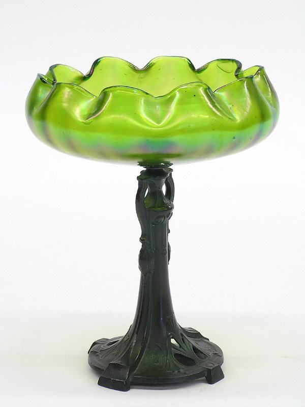 SoldLoetz Art Glass & Bronzed Compote,Martele pattern green iridescent 7" flora-form bowl in Art Nouveau style holder, small rim chip.See Sold Price