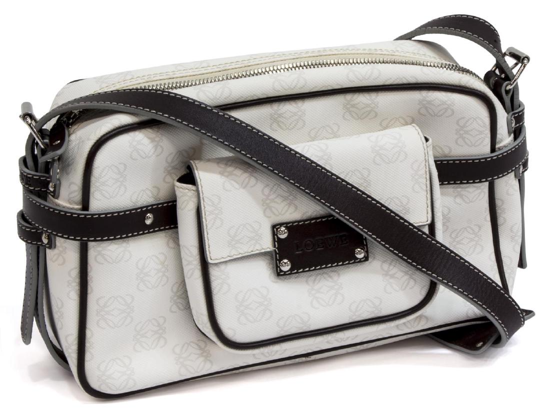 SoldLOEWE INTERCHANGEABLE POCKETS REPORTER BAGLoewe reporter bag, from the Loewe Pockets line, white monogram print coated canvas, dark brown kip leather trim and adjustable strap, silver hardware, interchangeable pockets, cotton lining, zipper tSee Sold Price
