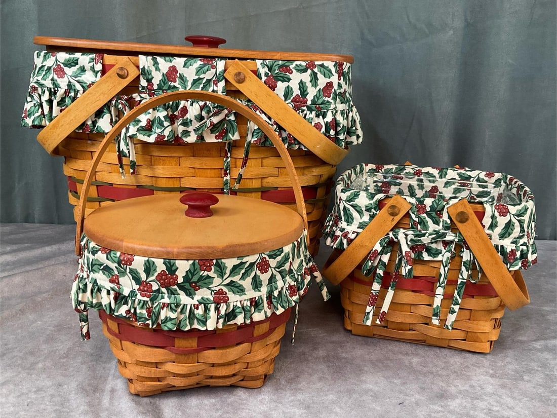 SoldThree Longaberger Christmas Collection Baskets2006 Christmas Collection Nature's Garland Basket with Liner, 1997 Christmas Collection Snowflake basket with liner and divided protector, and 2000 Deck the Halls Basket with liner and protector. AllSee Sold Price