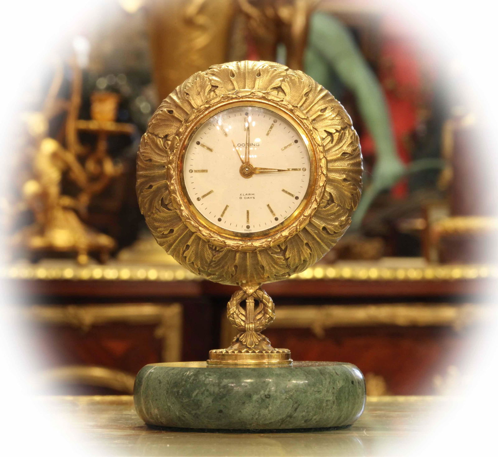 Looping table clock with eight days alarm, bronze