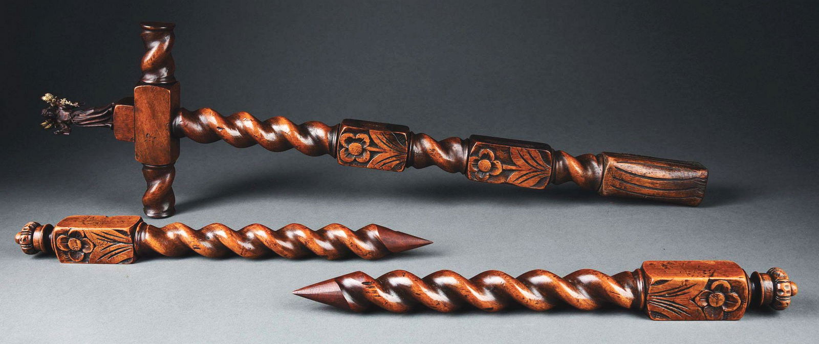 SoldAntique Vampire Killing Hammer and Stakes SetAntique Vampire Killing Hammer and Stakes Set, Carved Wood Angels and Crown Design. Each Stake: 15'' x 3.5'' x 2'' (38 x 9 x 5 cm); Hammer: 21'' x 18'' x 1.5'' (53 x 46 x 4 cm).See Sold Price