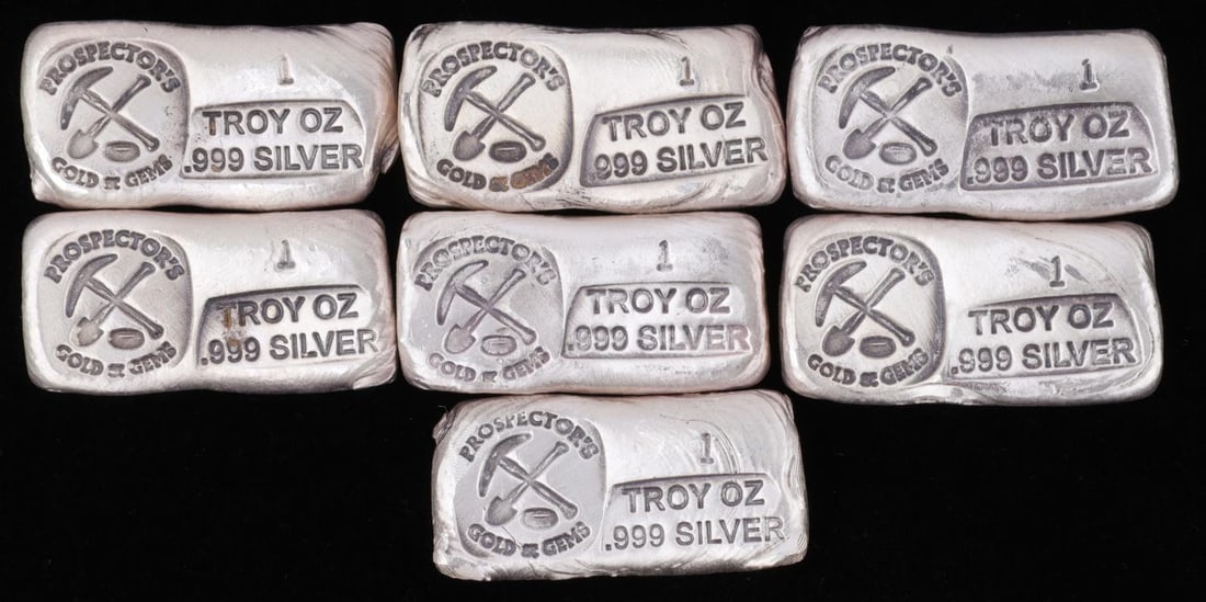 SoldAssortment of Silver Bars/Ingots and Silver Bullion Coin* Assortment of Silver Bars/Ingots and Silver Bullion Coin 7.1 ounces fine silver total weight. Includes one bar with skull motif, three matched 1 oz. cast silver bars, "Michigan" and "Nebraska" 1 troSee Sold Price