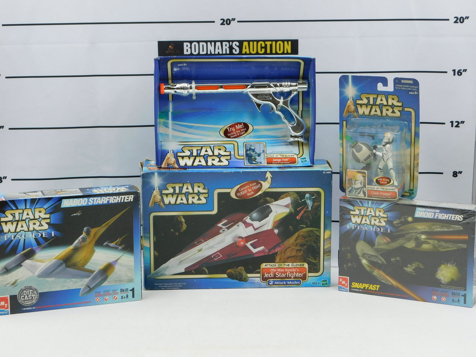 SoldLot of Star Wars Episode 1 and Attack of the ClonesLot of Star Wars Episode 1 and Attack of the Clones Vehicles and Figures. Including Attack of the Clones Jedi Starfighter - Open Box, Jango Fett Blaster - Sealed, and Clone Trooper - Sealed and EpisodSee Sold Price