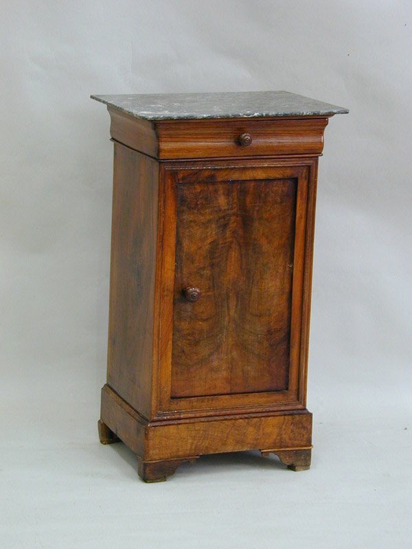 SoldFRENCH LOUIS PHILIPPE WALNUT BEDSIDE CABINETFrench Louis Philippe walnut nightstand, mid 19th c., having marble top with canted front corners, case fitted with drawer over cabinet, opening to interior shelf, rising on turned feet, approx 31.25"See Sold Price