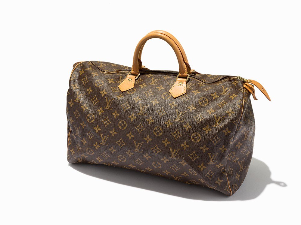 SoldA Louis Vuitton Brown Monogram Speedy 30 Louis VuittonA Louis Vuitton Brown Monogram Speedy 30 Louis Vuitton A Louis Vuitton Monogram Speedy 30, crafted from signature Louis Vuitton monogram on coated canvas, with vachetta leather trim, rolled top handleSee Sold Price