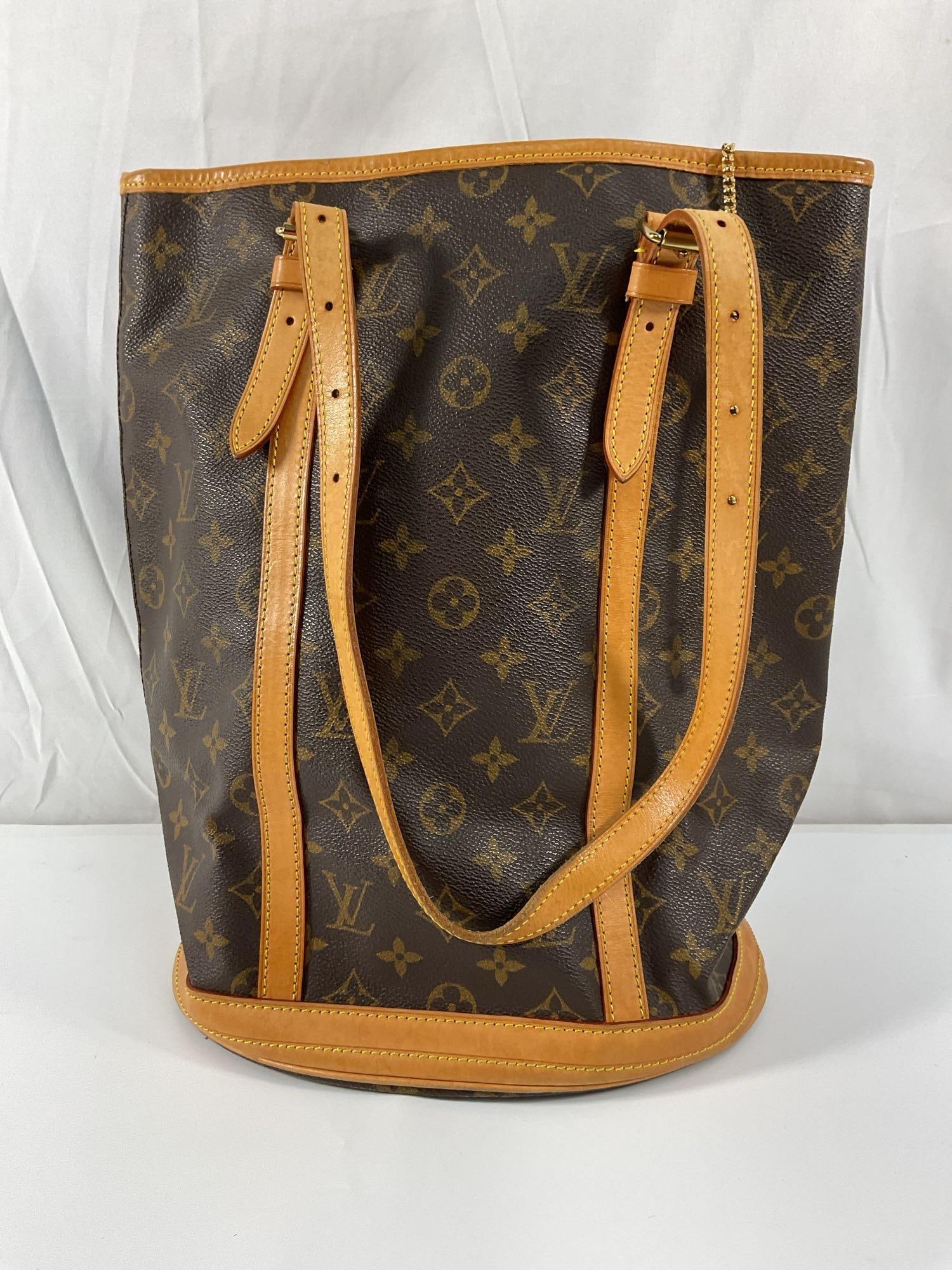 SoldLOUIS VUITTON MONOGRAM GM BUCKET BAGPRE-OWNED LOUIS VUITTON MONOGRAM CANVAS BUCKET BAG BROWN The Louis Vuitton Monogram Canvas Bucket Bag is a timeless piece that will never go out of style. It features a spacious interior with a zip pSee Sold Price