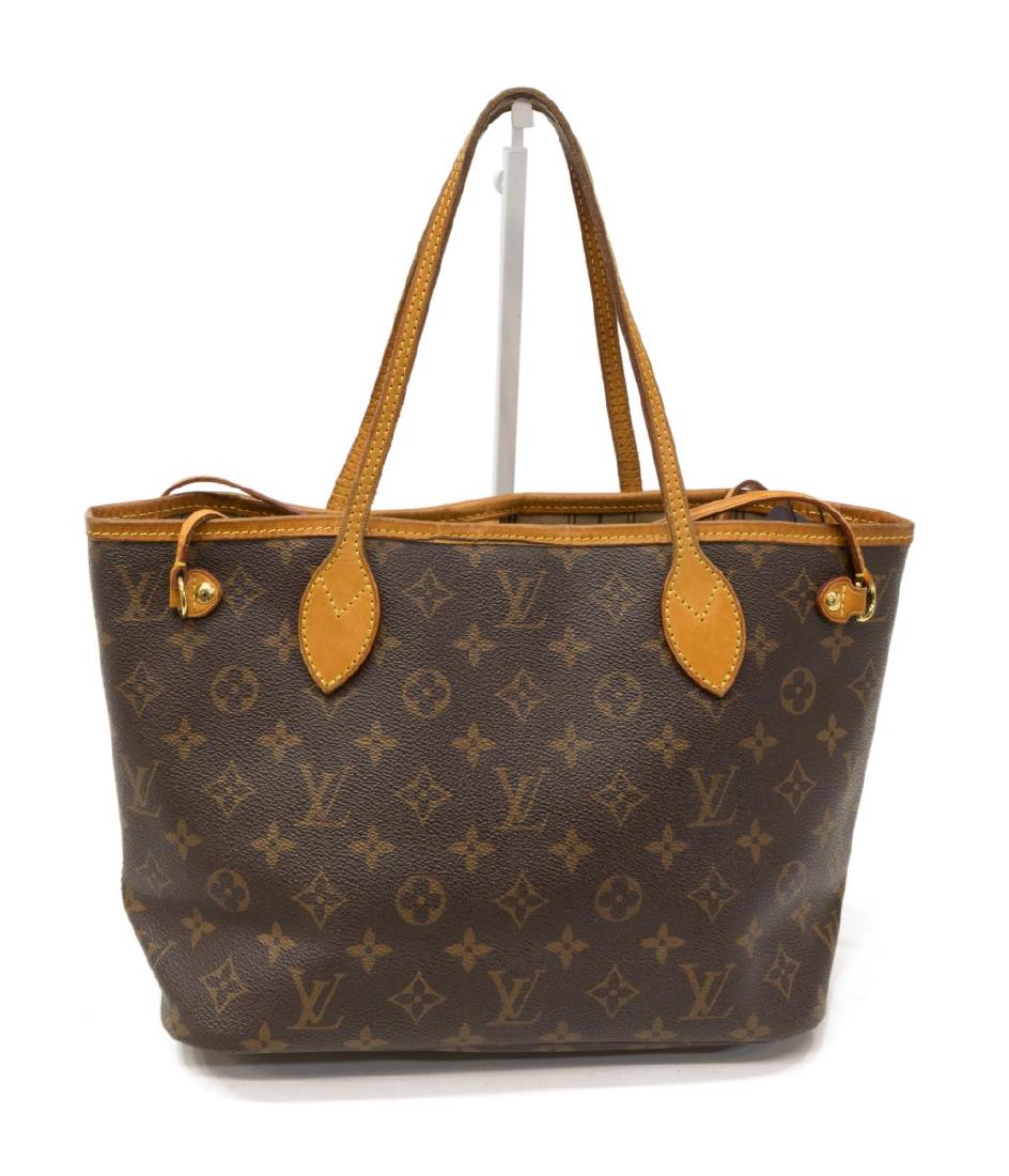 SoldLOUIS VUITTON NEVERFULL PM MONOGRAM CANVAS TOTELouis Vuitton “Neverfull PM†tote bag, in brown and tan monogram coated canvas, with brass hardware, tan vachetta leather trim, dual flat shoulder straps, dual drawstring closures at sides,See Sold Price
